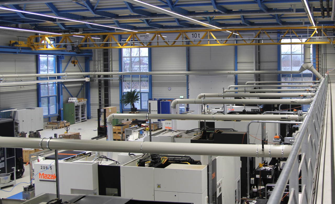 新厂房覆盖5000m²的生产面积,含三个生产厅,整体厂房配置中央过滤系统。另外,还为1号生产厅里的4台用油冷却的机床附加配置1台过滤系统,用于净化其排放的气体。鼓风机风量达16,000 m³/h,确保管道长度达150米时依然保持有效抽吸。