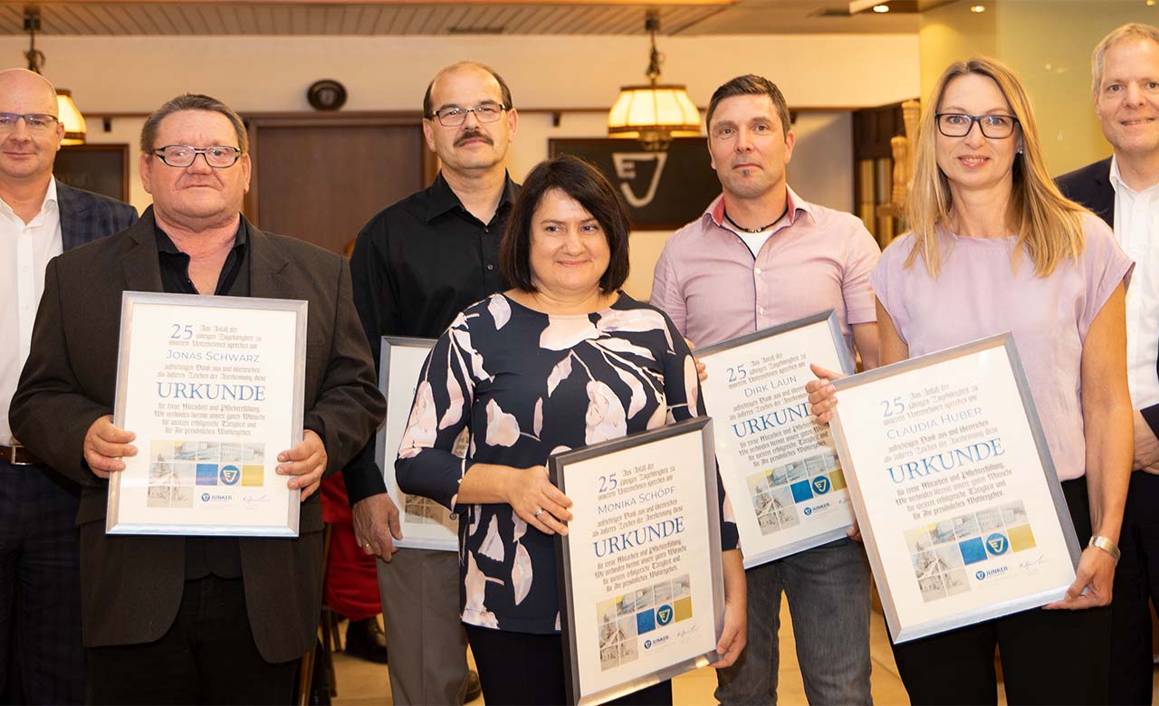 Rekordverdächtig viele Mitarbeiter können bzw. konnten in diesem Jahr bei der Erwin Junker Maschinenfabrik GmbH ihr Arbeitsjubiläum feiern. Die insgesamt 78 Betriebsjubilare bringen es zusammen auf stolze 1.820 Arbeitsjahre. Am 1. Oktober 2021 fand die Ehrung der Jubilare im firmeneigenen Gasthaus Stube in gebührendem, festlichem Rahmen statt.
