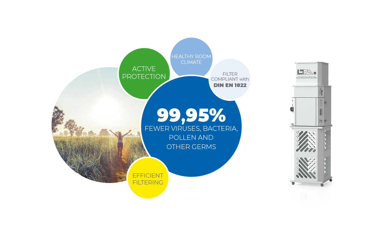 The air purifier considerably reduces the viral load when used in places where a high density of people cannot be avoided and distancing regulations cannot be enforced, such as manufacturing plants, conference rooms, canteens, workshops and offices. The Virus Cleaner VC 60 air purifier provides an additional preventative measure in all of these situations. The technology behind the Virus Cleaner VC 60 air purifier is based on LTA's forty years of expertise in air filtration.